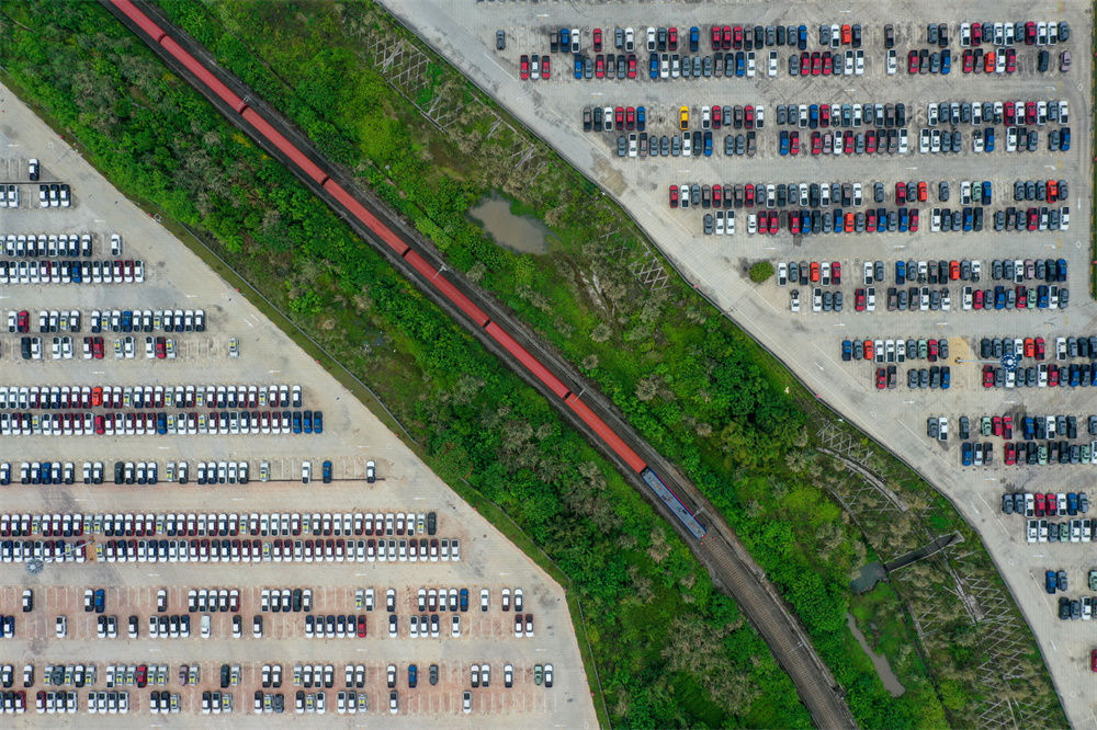 长城汽车专列首发列车在重庆永川国家高新区铁路专用线上(4月14日摄,无人机照片)。新华社记者 唐奕 摄