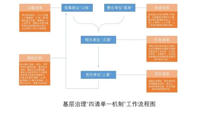 (二)工作机制标准化。以群众需求为导向,建立“四清单一机制”工作法,即问题清单、资源清单、任务清单、项目清单及督查督办机制,辖区党建全路径打通,跨社区、跨部门资源共享。