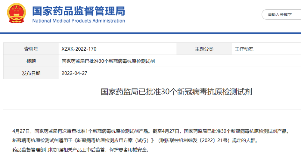 4月27日,国家药监局再次审查批准1个新冠病毒抗原检测试剂产品。截至4月27日,国家药监局已批准30个新冠病毒抗原检测试剂产品。
