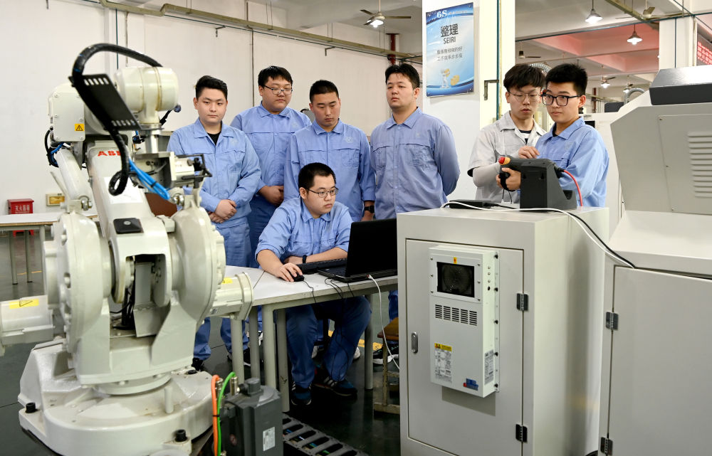 西安技师学院数控技术专业学生在学习操控数控机床(4月27日摄)。新华社记者刘潇摄