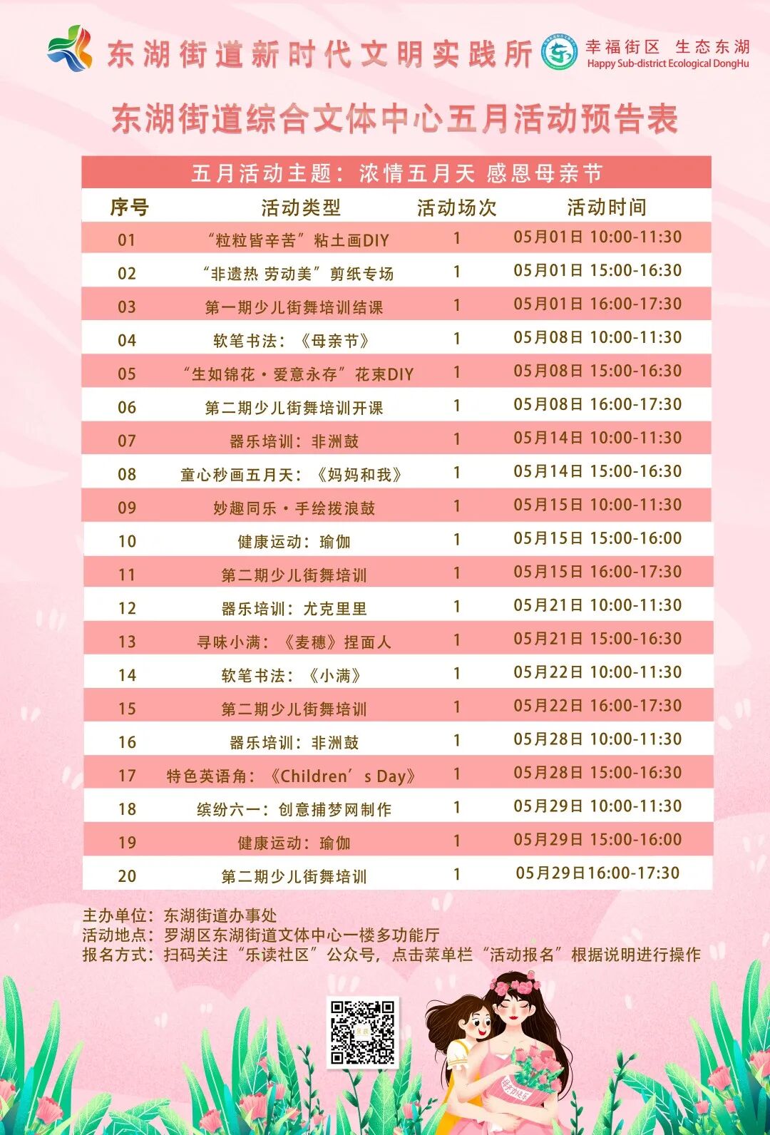 慢慢告别春的萌动,缓缓迎接夏的生长,五月有趣有盼,东湖街道综合文体活动中心亦有别具特色的活动:融合了节日氛围的剪纸、捏面人等非遗文化活动;粘土画和手绘画激发辖区居民的无限创意;软笔书法《母亲节》和花束DIY更是很好地诠释“母亲节”主题;除此之外,瑜伽、器乐培训等常规活动也依旧会与大家见面,一起看看活动细节吧~