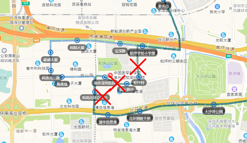 双方向取消“荔枝世界、松坪村、朗山路中、阜外深圳医院、特发小区”等5对公交停靠站,增加“宝深路、科陆大厦、豪威大厦、科技北二路、海普瑞”等5对公交停靠站。