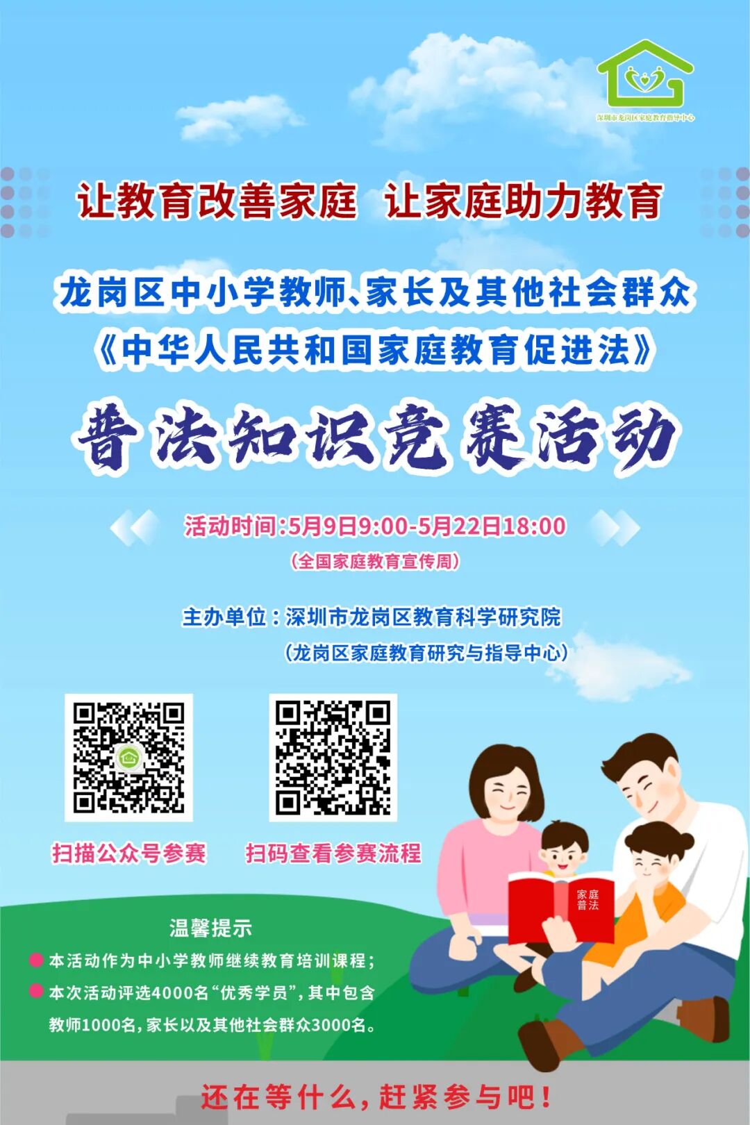 龙岗区教育科学研究院在龙岗全区举办《中华人民共和国家庭教育促进法》普法知识竞赛活动旨在倡导全社会树立依法带娃理念,科学开展家庭教育,促进未成年人健康成长