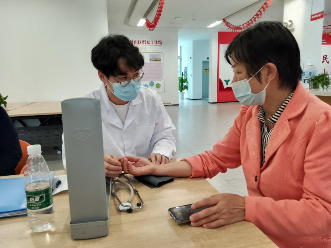 义诊现场,青年健康志愿者帮助居民群众测血压,并针对就诊人群的不同病症和个体差异提出了诊疗建议与治疗方案,还为居民普及常见病、多发病的预防知识和中医药发挥治未病作用优势,促进居民树立正确的健康观。