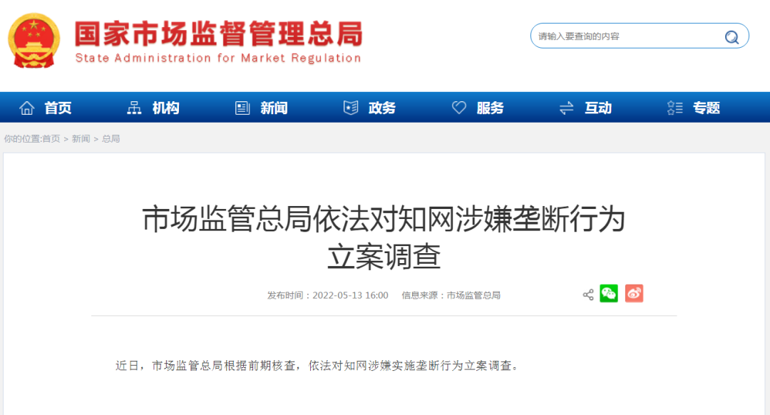 近日,市场监管总局根据前期核查,依法对知网涉嫌实施垄断行为立案调查。
