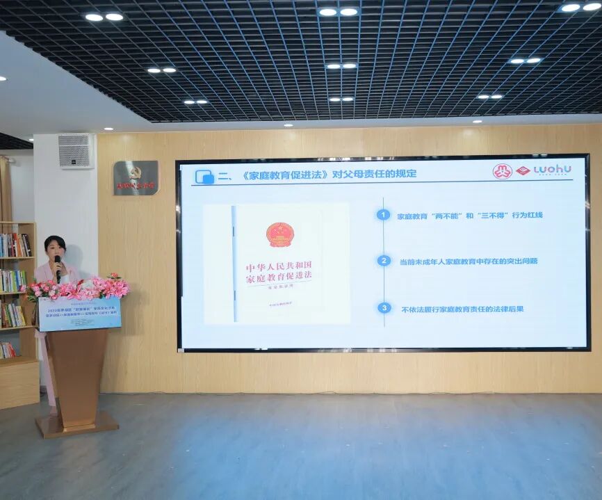 5月15日下午,由罗湖区妇联与罗湖区教育局牵头主办,罗湖区委组织部、区委政法委、罗湖区法院等单位协办,在罗湖区东湖街道大望社区党群服务中心举办了罗湖区“懿家成长”家庭文化沙龙暨罗湖《家庭教育令》实施指引发布活动——社区家长学校家庭教育论坛。