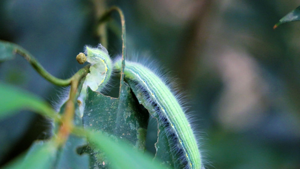 2022年5月21日,在中国·红河蝴蝶谷拍摄到的箭环蝶幼虫。(高飞 摄)