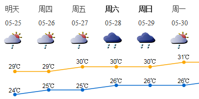 26-30日多云,间中有阵雨或雷阵雨,部分时间雨势较大。