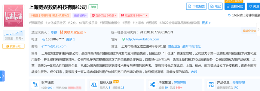 企查查显示,哔哩哔哩公司名为上海宽娱数码科技有限公司,公司致力于第一流的互联网宽频技术开发和应用服务,并全资拥有英雄宽频网。公司与众多内容提供商建立了新型战略合作关系,自市场化运作以来,凭借全新的技术和优质的服务,公司已成长为集产品研发、运营、销售为一体综合性互联网企业,已成为国内高清晰网络宽频技术开发与应用的领先者。