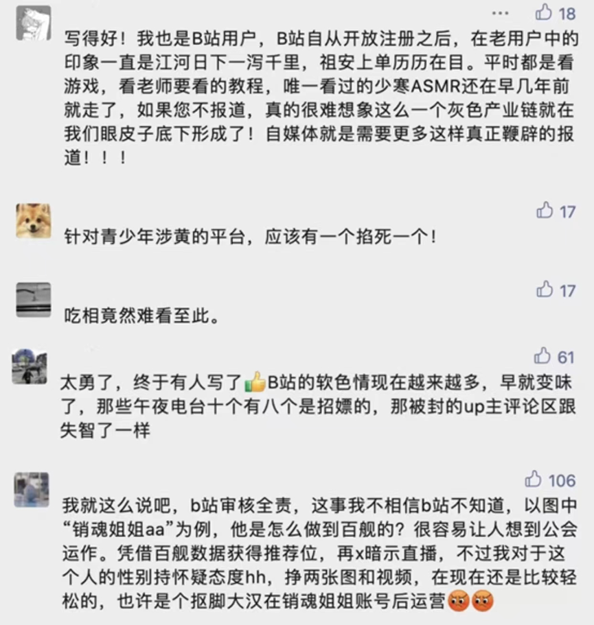 对此,网友们议论纷纷——“吃相竟然难看至此”“B站的软色情现在越来越多,早就变味了”“真的很难想象这么一个灰色产业链就在我们眼皮子底下形成了”……