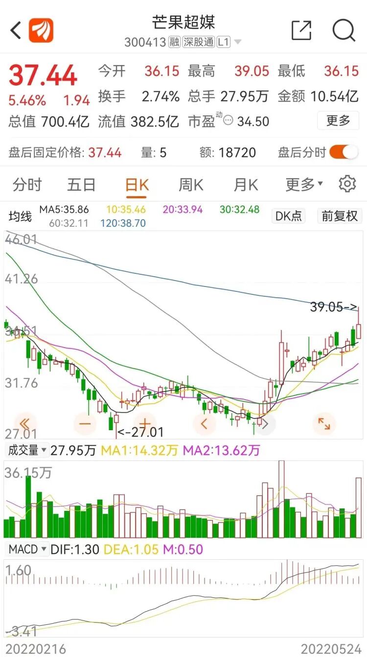 5月24日上午,“王心凌概念股市值蒸发千亿”又登上了热搜。不过,24日开盘后,芒果超媒股价大幅拉升,盘中涨幅一度扩大至10%。截至当日收盘,芒果超媒股价报37.44元/股,涨幅5.46%。