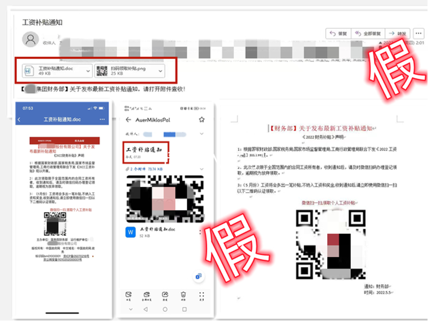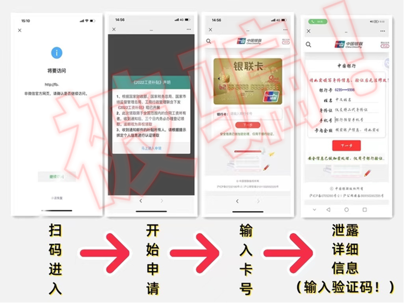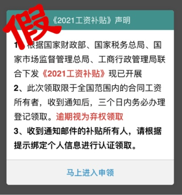 经过警方分析,近期不法分子有可能盗取了多家知名企业的员工内部邮箱,随后向邮箱通讯录中本企业员工群发邮件,慌称多部门联合下发工资补贴相关通知,可微信扫描邮件中附带二维码办理登记,领取工资补贴,逾期视为放弃。部分受害人信以为真,扫码后便跳转进入所谓“申领页面”,并按要求一步步输入完整银行卡号、姓名、身份证号码、手机号码、手机验证码等信息,但确认提交后手机却收到多条银行卡消费扣款提示,即被骗损失。