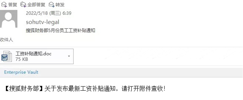 根据爆料图片显示,搜狐员工于5月18日早晨6:39分收到一封主题为“搜狐财务部5月份员工工资补贴通知”的邮件,邮件正文内容为“【搜狐财务部】关于发布最新工资补贴通知,请打开附件查收!”邮件中包含一则 “工资补贴通知”的文档附件。