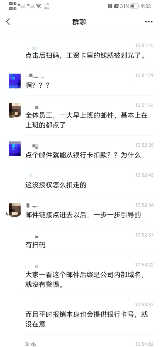 群聊记录显示,有人称搜狐员工点击邮件后,在一步步引导下扫码,工资卡里的钱就被划光了。并称因为是一大早上班的邮件,基本在上班的员工都点了。大家看到这个邮件后缀是公司内部域名,而且平时报销本身也会提供银行卡号,就没有警惕。在有人询问被诈骗总额和被骗人数时,该爆料者回复“据说有多有少啊,据说有的人工资卡里有十来万呢……”并调侃“一个网络公司,被人偷了家。”