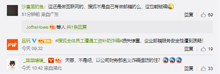 事件的缘起是这样的,5月24日下午,微博教育博主“王落北”发文爆料,“有粉丝投稿称搜狐员工收到一封内部域名发来的诈骗邮件,主题是工资补贴,很多员工都点了,据说被骗人数和金额巨大”。该条爆料中还包含诈骗邮件截图以及疑似搜狐内部群聊记录等图片。