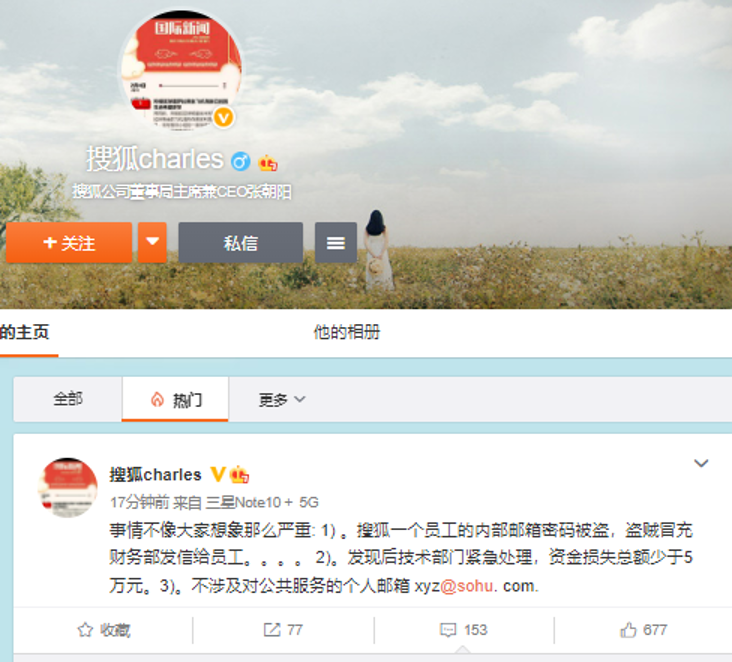 上午11时50分,搜狐公司CEO张朝阳在微博发文回应,其称“事情不像大家想象那么严重:(1)搜狐一个员工的内部邮箱密码被盗,盗贼冒充财务部发信给员工。(2)发现后技术部门紧急处理,资金损失总额少于5万元。(3)不涉及对公共服务的个人邮箱 xyz@sohu.com.”