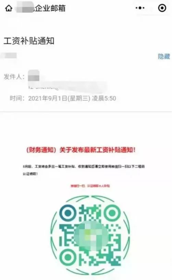 2021年9月,江苏南京的徐女士收到一封主题为“工资补贴通知”的企业邮件,邮件显示,工资将会多出一笔补贴,使用微信扫一扫下方的二维码,认证后便可领取补贴。