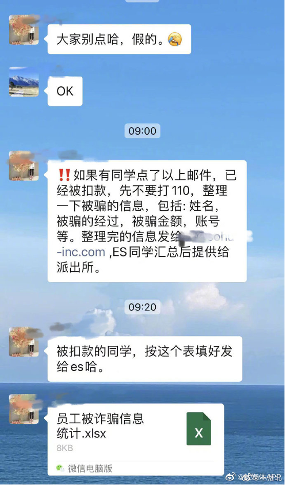 另据疑似搜狐公司内部群聊记录显示,有工作人员在群聊中发布提醒,让大家不要点击邮件。并发言称“如果有同学点了以上邮件,已经被扣款,先不要打110,整理一下被骗的信息,包括:姓名,被骗的经过,被骗金额,账号等。整理完的信息发给……,ES同学汇总后提供给派出所。”20分钟后,该人员上传“员工被诈骗信息统计”表格并要求被扣款的同学填写。