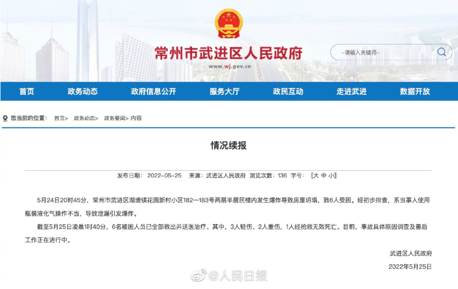 2022年5月24日20时45分,常州市武进区一栋两层半居民楼内发生爆炸导致房屋坍塌,致6人受困。经初步排查,系当事人使用瓶装液化气操作不当,导致泄漏引发爆炸。