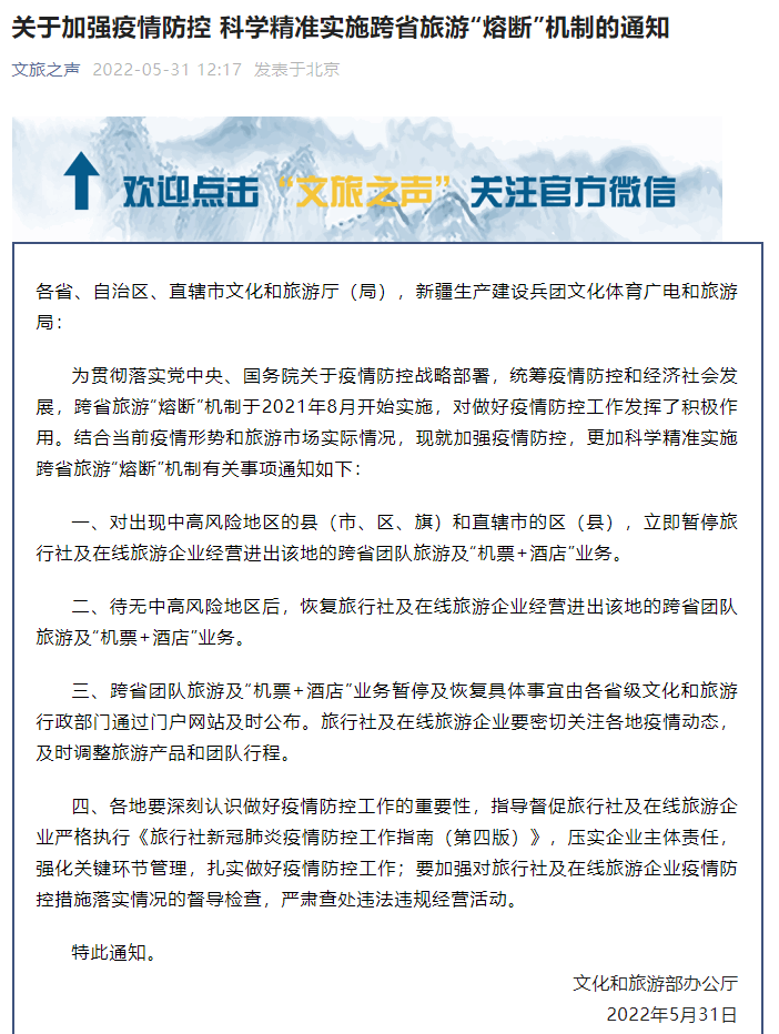 据文旅部网站消息,文旅部办公厅5月31日发布关于加强疫情防控科学精准实施跨省旅游“熔断”机制的通知。通知如下: