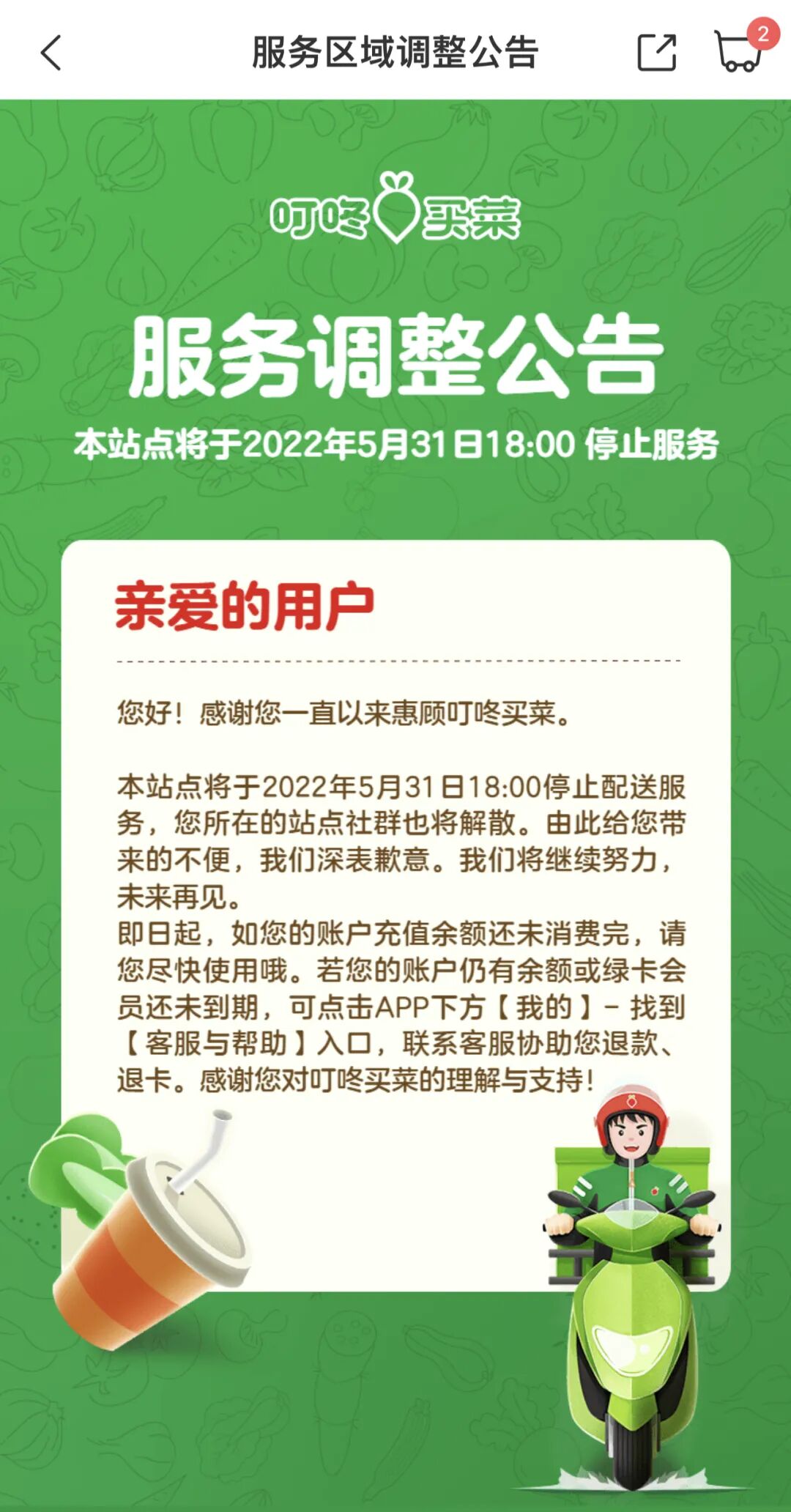 公告显示,“本站点将于2022年5月31日18:00停止配送服务,您所在站点社群也将解散”。