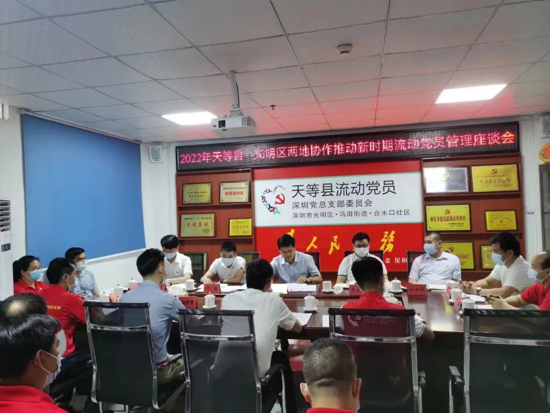 6月7日下午,光明区与广西崇左市天等县“两地协作推动新时期流动党员教育管理座谈会”在马田街道合水口社区召开,听取天等县流动党组织在深工作情况汇报,组织流动党员代表交流座谈,研究加强新时期新阶段流动党员教育管理工作。区委常委、组织部部长曾无非,天等县委书记麦成柱,光明区委组织部、马田街道党工委、天等县有关负责同志,20名流动党员代表参加活动。
