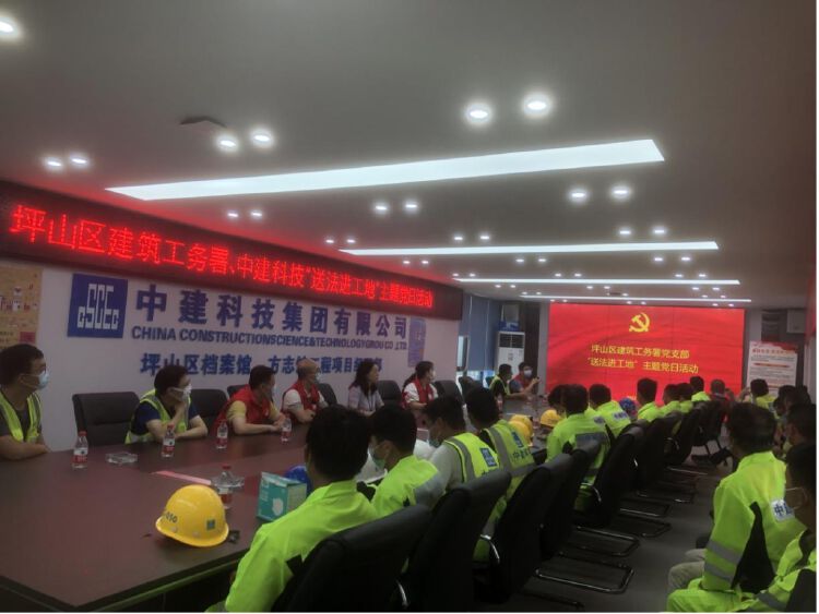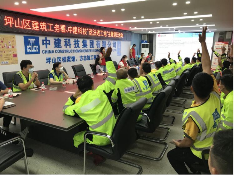 近日,坪山区建筑工务署以党建引领,开展“送法进工地”主题党日系列活动,进行《民法典》专项学习宣贯,旨在增强在建工地项目人员法治思维和依法维权的法治意识。