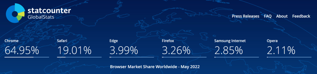 美国广播公司援引互联网分析公司Statcounter的数据指出,截至2022年5月,Chrome浏览器占据了全球浏览器市场约65%的份额,紧随其后的是Apple的Safari,份额为19%。IE的继承者Edge市场份额少于4%,略高于Firefox。