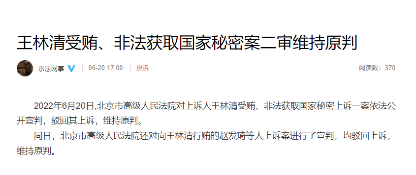 2022年6月20日,北京市高级人民法院对上诉人王林清受贿、非法获取国家秘密上诉一案依法公开宣判,驳回其上诉,维持原判。