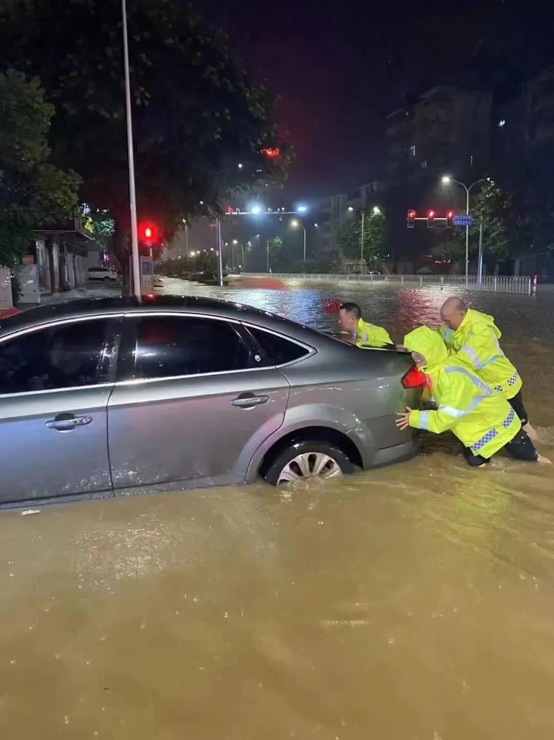 武江区芙蓉山派出所警力在工业中路书城路口把在水中熄火的车辆向安全区域推行。