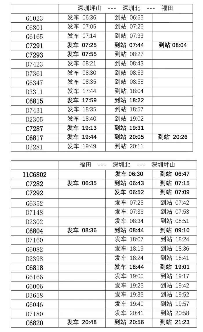 坪山开往福田的C7291次捷运化列车,发车时间较之前提前了约20分钟,能更好地满足市民朋友早高峰的出行需求,调图后早晚高峰具体车次时刻表如下⬇️