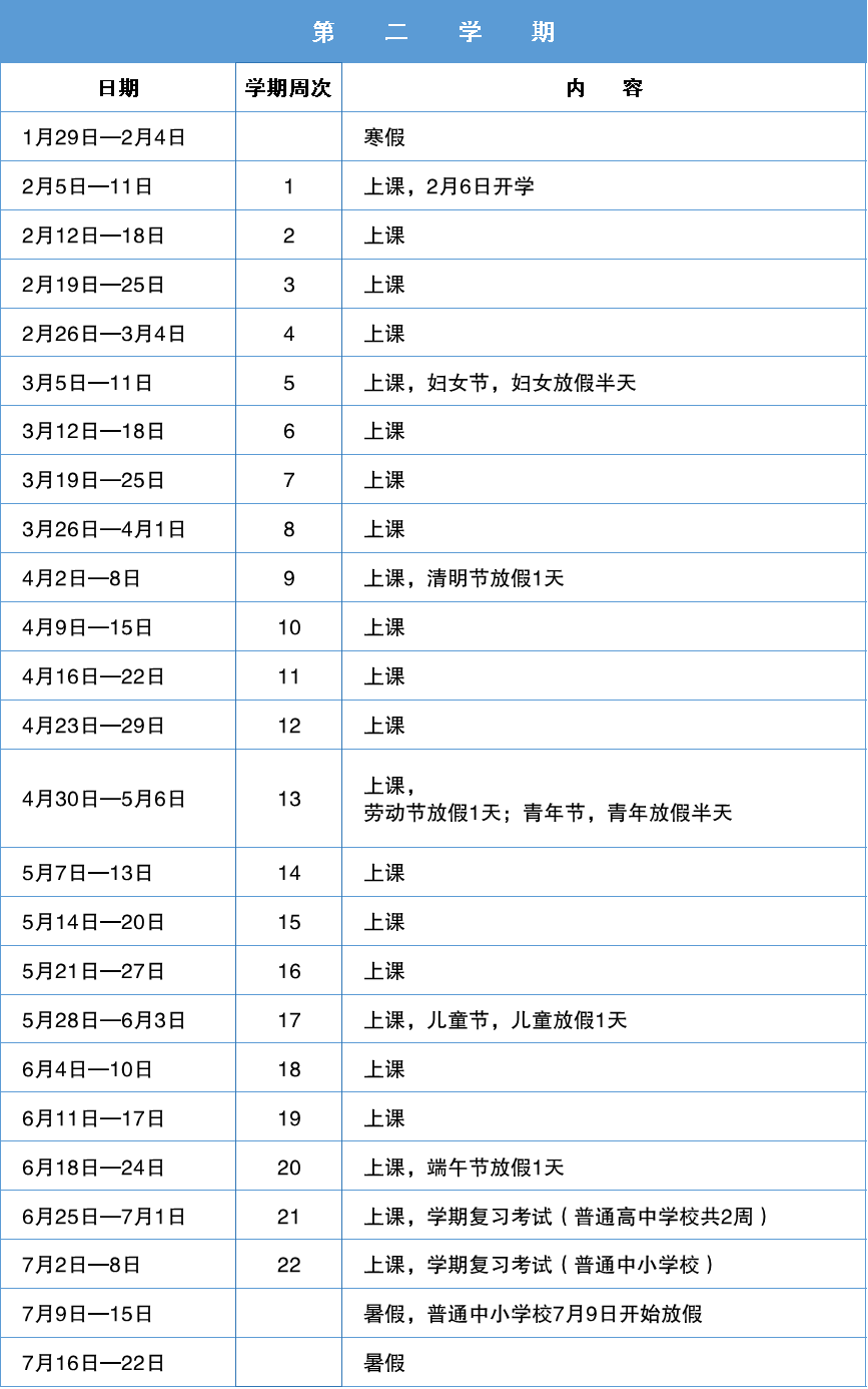 ●第二学期22周,2023年2月6日开学,暑假从2023年7月9日开始。