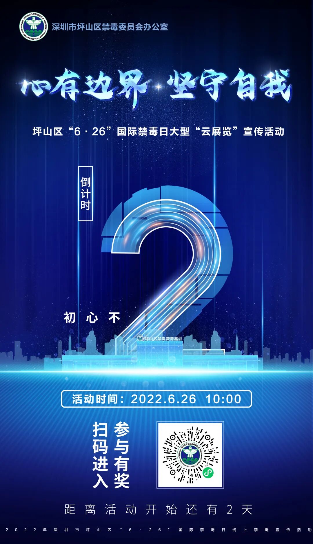 为深入推进新时代全民禁毒工程建设,提升毒品预防教育全覆盖和增强全民防毒拒毒意识,大力营造社会禁毒文化氛围,根据防疫工作要求,坪山区将于6月26日开展以“心有边界 坚守自我”为主题的“6·26”国际禁毒日大型“云展览”宣传活动。
