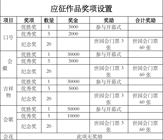 此次口号、会徽、吉祥物、会歌征集,每项设立优胜奖1名、优秀奖5名,并设置对应的现金奖励、奖牌、纪念证书及世园会入场门票。其中,会徽、吉祥物优胜奖作品奖金3万元人民币,会歌优胜奖奖金5万元人民币。口号、会徽、吉祥物、会歌优胜奖获得者届时还将有机会获邀参与成都世园会开幕式。
