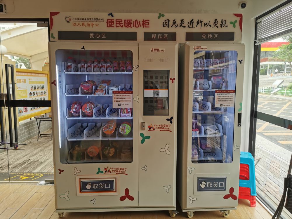 记者在深圳市龙华区福城街道兴富社区的“暖蜂驿站”看到,桌椅整齐摆放、不时有小哥在此休息,旁边还设有便民暖心柜,内有泡面、饼干、矿泉水等。“有需要扫码就可以取货,一天可以免费扫一次。”外卖小哥陈伟说。