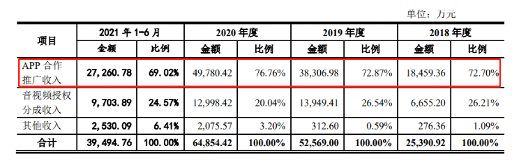 其中,App合作推广是公司营收的绝对主力。2018年至2020年,该部分业务收入分别为1.85亿元、3.83亿元、4.98亿元,占总营收的比重分别为72.7%、72.87%、76.76%。具体而言,该部分业务就是“制作产品——提供用户免费使用,获取用户——App接入广告——获得分成”的模式。而音视频授权大概贡献两成多的收入,儿童启蒙衍生品和用户内容付费加起来也才几个百分点。