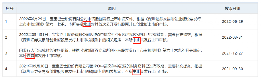 6月29日晚间,深交所官网显示,宝宝巴士股份有限公司(以下简称“宝宝巴士”)创业板IPO终止。形式上看,宝宝巴士还是自己申请撤回发行上市申请文件,距离前次恢复审核刚好半年时间。