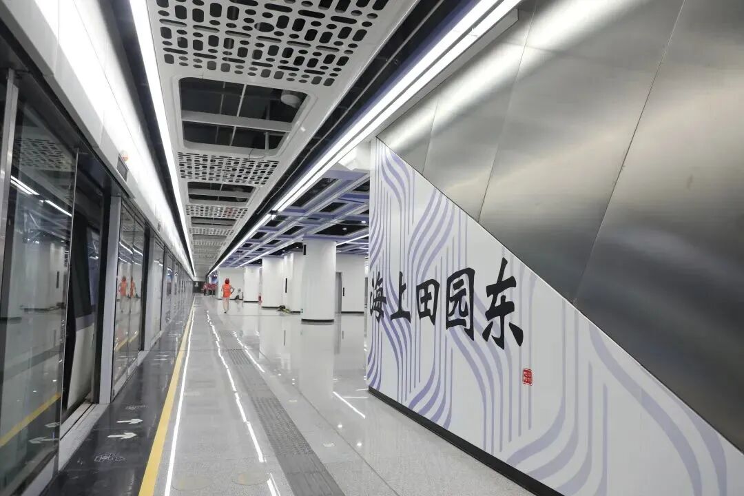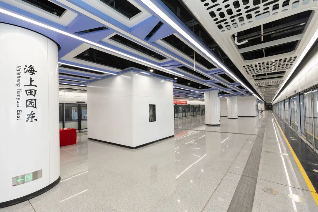 海上田园东站位于“科技之网”的范围内,车站内采用淡紫色,设计中加入富有速度感的竖向线条,天花板从“1、0、1、0”提取元素,这些设计都体现出满满科技感,柱面上,镶嵌与主题色呼应的紫色花纹。