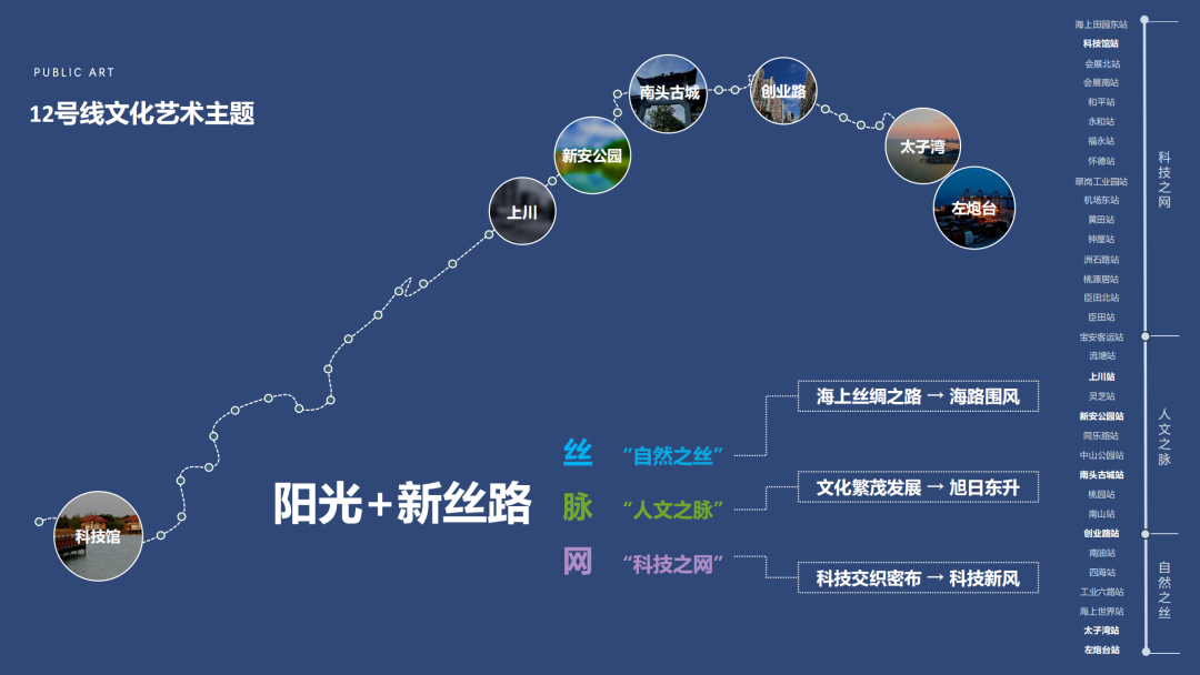 12号线结合“粤港澳大湾区”的发展战略和自身在深圳西部规划发展中的互联中枢作用,将12号线的文化主题设定为“新丝路”。
