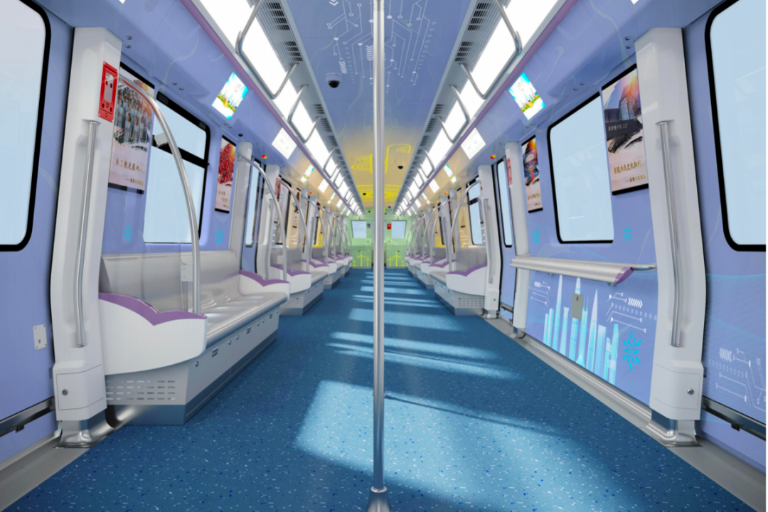 第三节车厢星罗棋布,以蓝色为主色调体现科技元素。