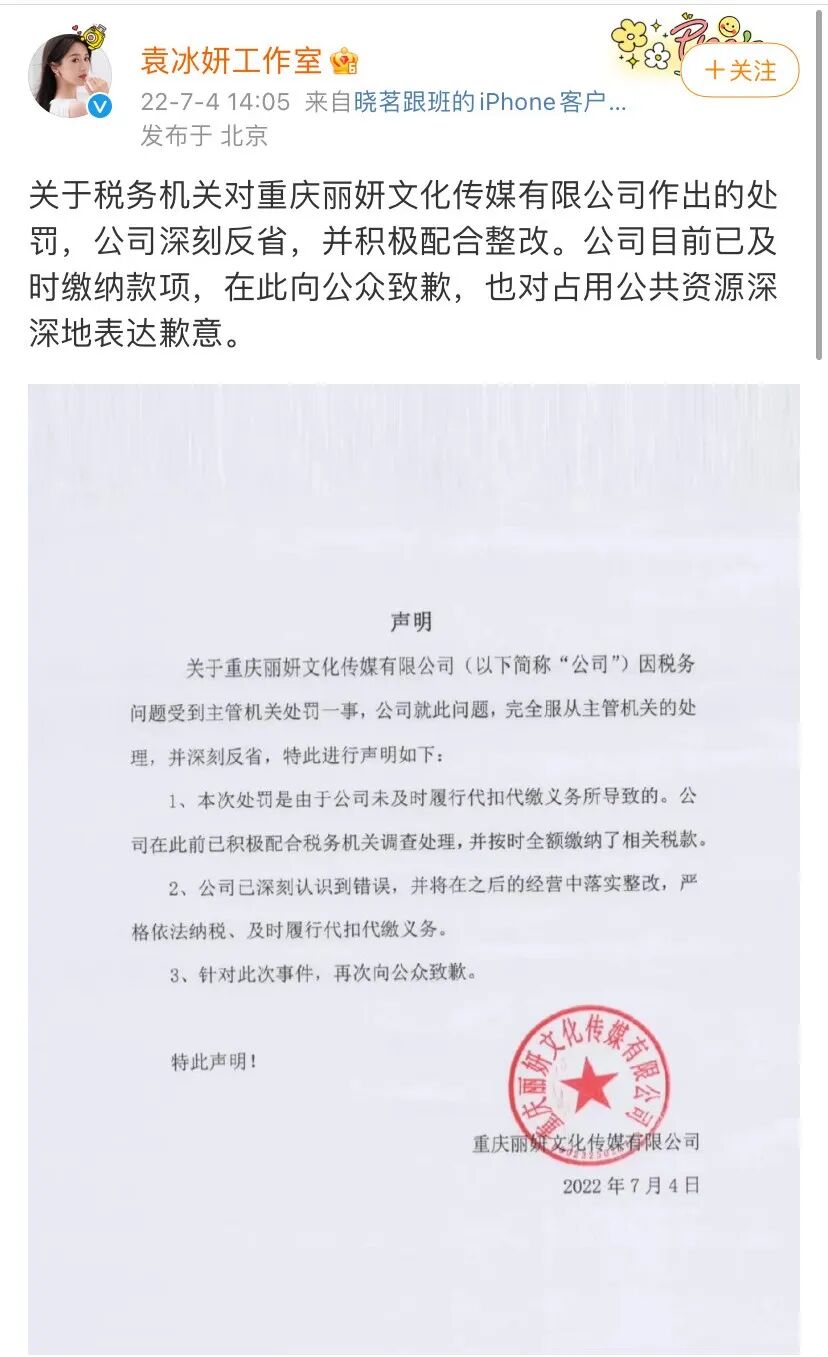 7月4日午后,袁冰妍工作室发布声明称,关于税务机关作出的处罚,公司深刻反省,并积极配合整改。公司目前已及时缴纳款项,在此向公众致歉,也对占用公共资源深深地表达歉意。