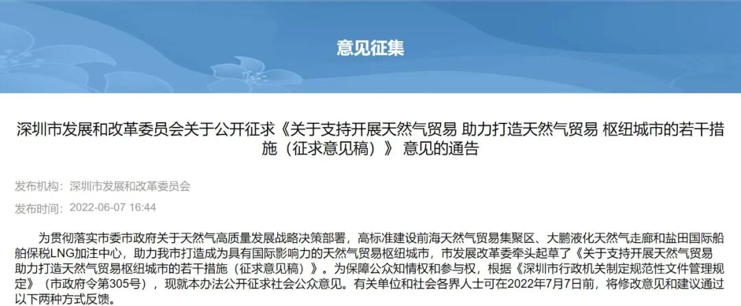 日前,深圳市发展改革委牵头起草了《关于支持开展天然气贸易助力打造天然气贸易枢纽城市的若干措施(征求意见稿)》,提出高标准建设前海天然气贸易集聚区、大鹏液化天然气走廊和盐田国际船舶保税LNG加注中心,助力深圳打造成为具有国际影响力的天然气贸易枢纽城市。