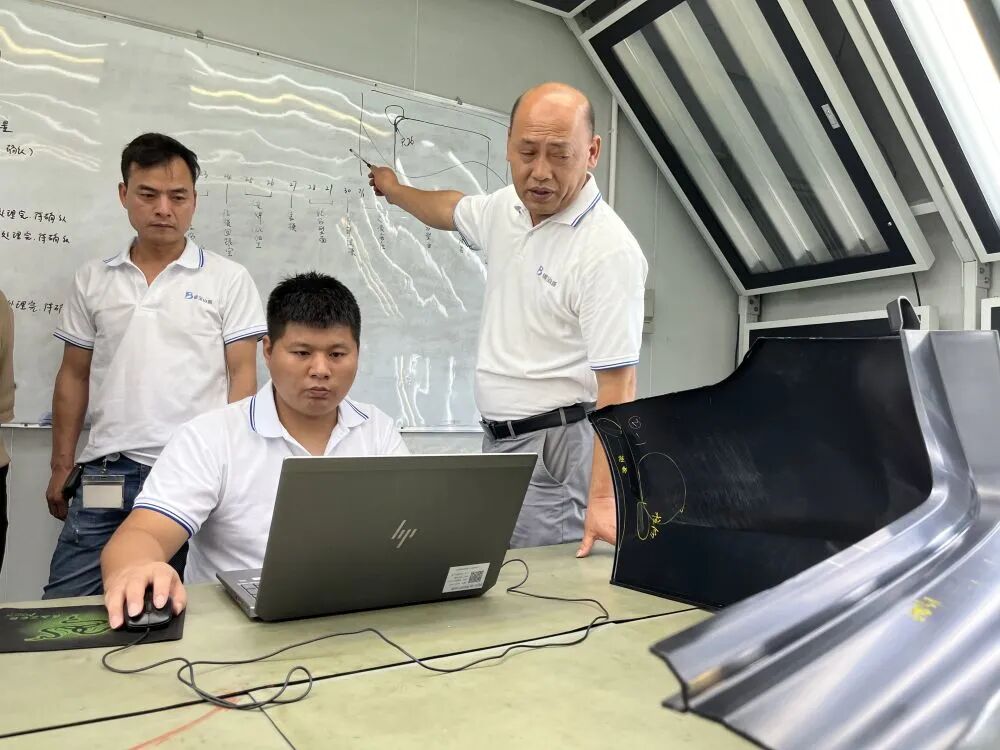 这是古显善(右一)与技术团队讨论模具制作图调整方案。
