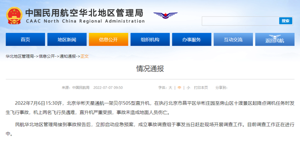 2022年7月6日15:30许,北京华彬天星通航一架贝尔505型直升机,在执行北京市昌平区华彬庄园至房山区十渡景区起降点调机任务时发生飞行事故,机上两名飞行员遇难,直升机严重受损,事故未造成地面人员伤亡。