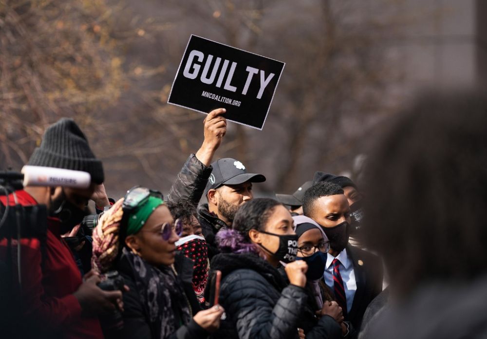 2021年4月20日,得知肖万被控的谋杀和过失杀人等三项罪名全部成立后,民众手举“有罪”的标语聚集在美国明尼阿波利斯市的法庭附近。新华社发(本·布鲁尔摄)