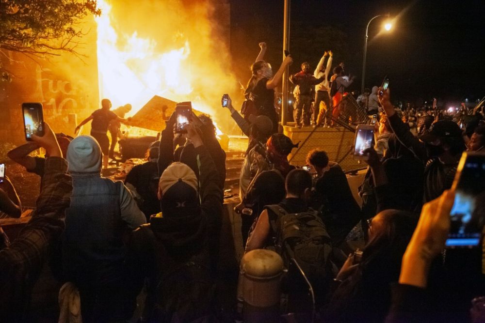 2020年5月28日,在美国明尼苏达州明尼阿波利斯市,示威者点燃一警察局。新华社发(本·霍夫兰摄)
