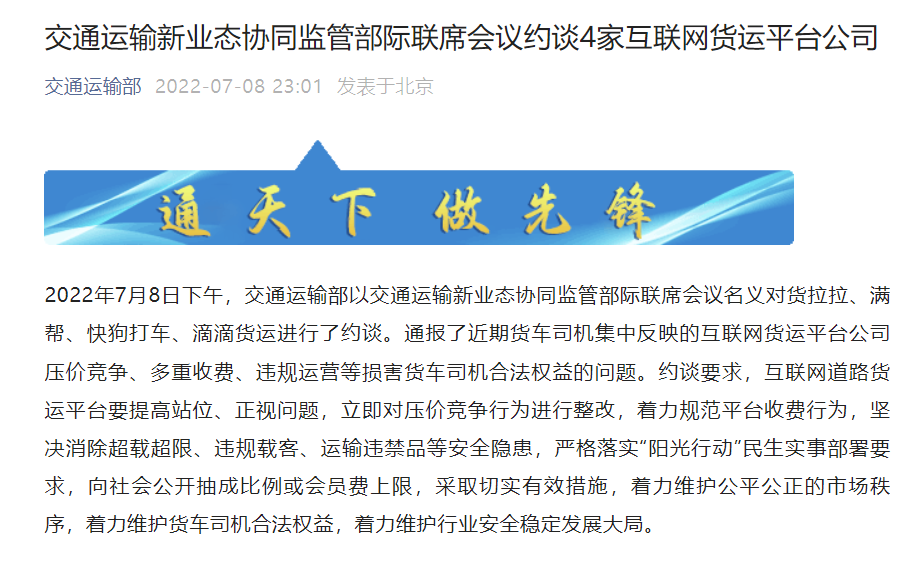 2022年7月8日下午,交通运输部以交通运输新业态协同监管部际联席会议名义对货拉拉、满帮、快狗打车、滴滴货运进行了约谈。通报了近期货车司机集中反映的互联网货运平台公司压价竞争、多重收费、违规运营等损害货车司机合法权益的问题。约谈要求,互联网道路货运平台要提高站位、正视问题,立即对压价竞争行为进行整改,着力规范平台收费行为,坚决消除超载超限、违规载客、运输违禁品等安全隐患,严格落实“阳光行动”民生实事部署要求,向社会公开抽成比例或会员费上限,采取切实有效措施,着力维护公平公正的市场秩序,着力维护货车司机合法权益,着力维护行业安全稳定发展大局。