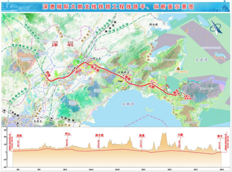 深惠城际大鹏支线工程线路起于龙岗区龙城站,止于大鹏新区新大站,途经龙岗区、坪山区、大鹏新区,全线地下敷设,线路全长39.387km。