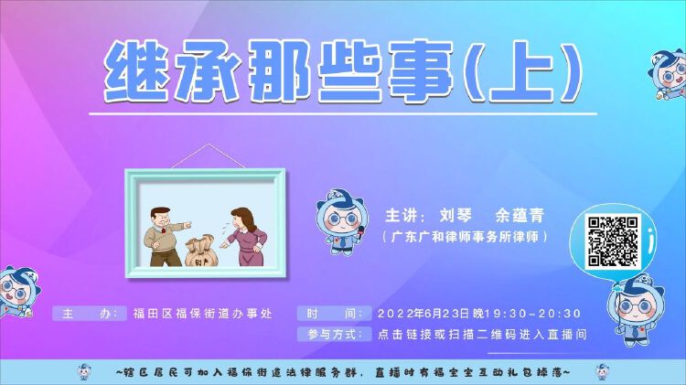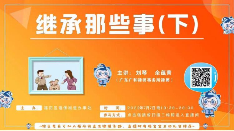 随着社会经济生活的不断发展,以及中国人口老龄化的加剧,遗产继承问题越来越受到居民重视。为提升居民关于继承的法律知识水平,提前规避相关法律风险,6月底至7月初,福保街道办事处特别邀请广东广和律师事务所律师刘琴、余蕴青做客福保街道直播间,围绕“继承那些事”与居民朋友们分上下两期共同探讨了遗产继承的相关法律问题。