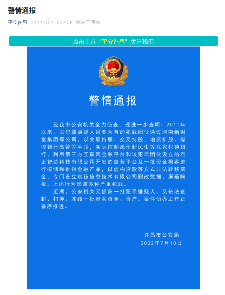 (原标题《河南许昌警方通报村镇银行案:又抓获一批犯罪嫌疑人》)